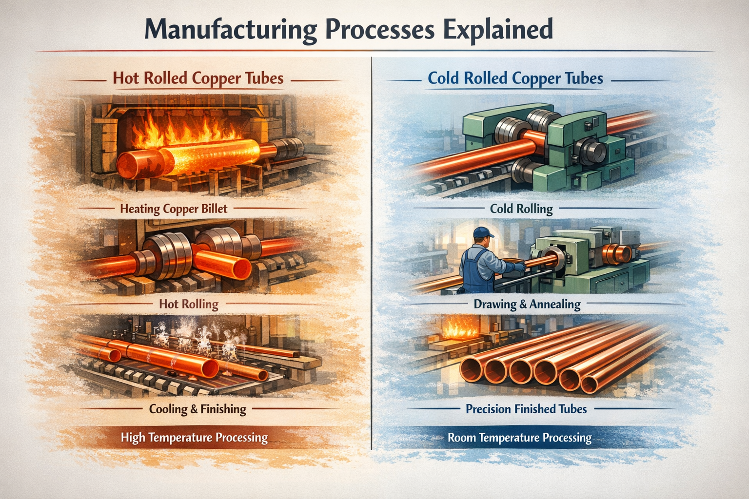 Produksjonsprosessen er grunnlaget for ytelsesforskjeller mellom kaldvalsede og varmvalsede kobberrør. En kvalifisert kobberrørfabrikk tilbyr vanligvis begge alternativene for å betjene ulike markedskrav.