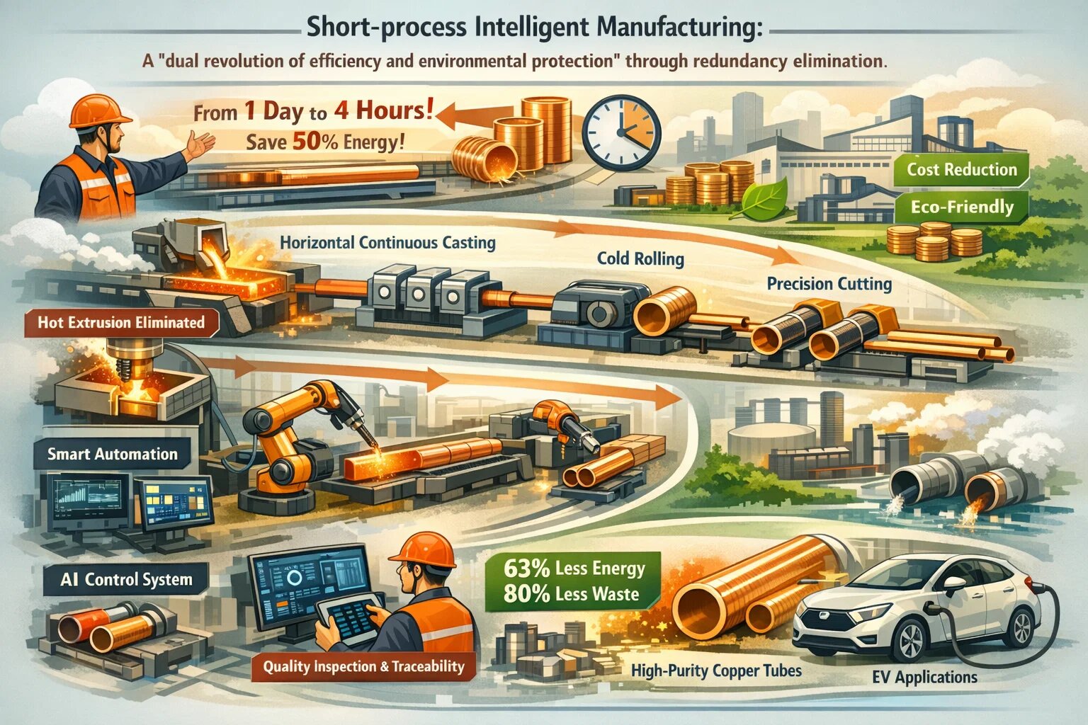 I 2025, konkurransefokuset til kobberrør industrien skiftet fra "markedssiden" til "produksjonssiden", med en omfattende kamp rundt prosessinnovasjon og -optimalisering . På den ene siden øker «kort-prosess intelligent produksjon» sterkt ved å eliminere redundans, forbedre effektiviteten og redusere energiforbruket, omforme industriens kostnads- og miljøfordeler gjennom digitalisering og integrert produksjon. På den ogre siden opprettholder "lang prosess tradisjonell produksjon" sin posisjon med sine "modne og stabile, allment anvendelige" egenskaper, og beholder sin uerstattelige rolle i komplekse spesifikasjoner og masseproduksjon. Dette teknologiske oppgjøret mellom "strømlinjeformet intelligens" og "tradisjonell stabilitet" omskriver kjernereglene for produksjon av kobberrør.