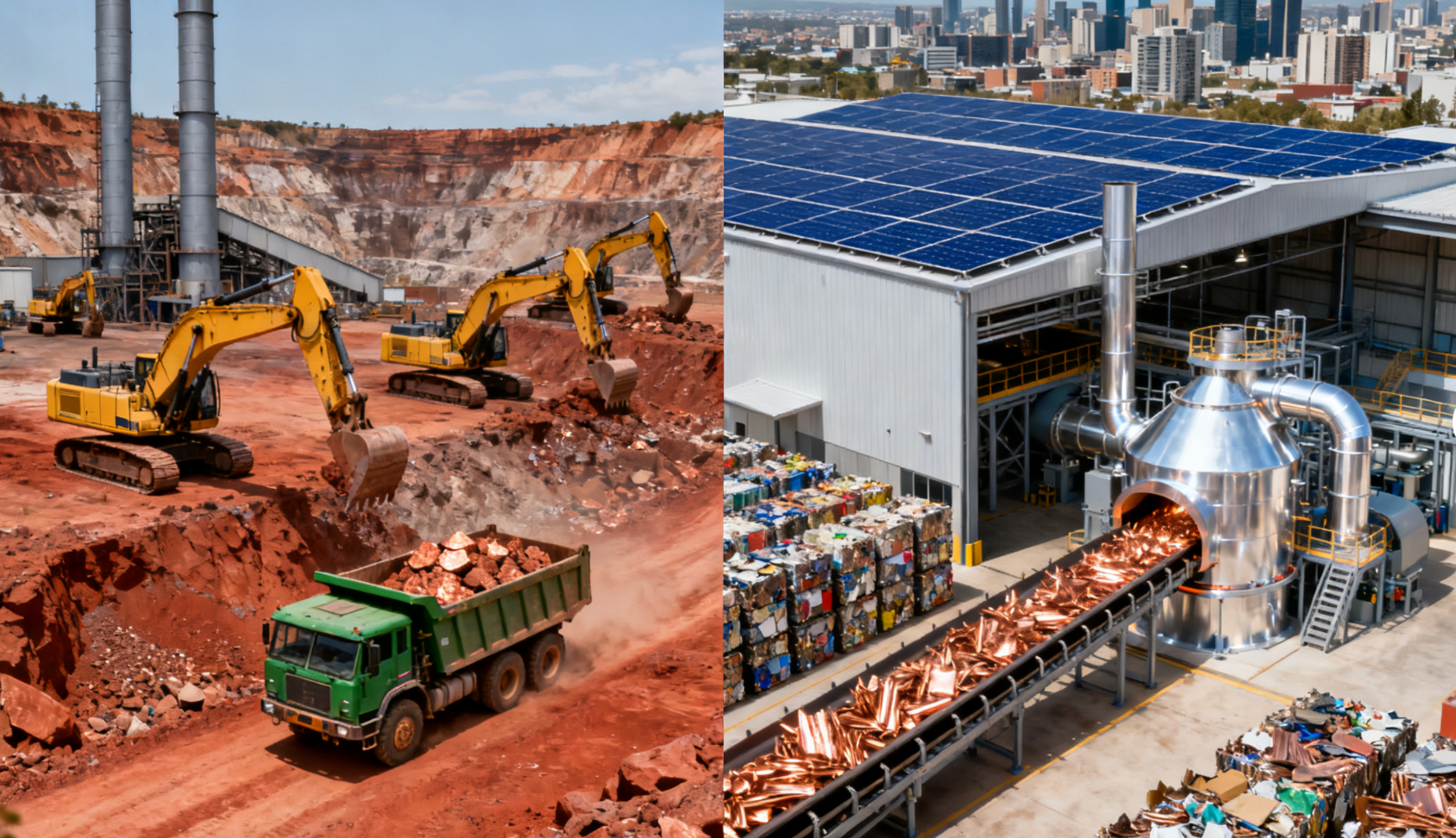 (Bildetekst: Den grunnleggende dikotomien: Ressursutvinning (lineær økonomi) versus ressursregenerering (sirkulær økonomi) representerer motstridende visjoner for fremtiden for kobberrørproduksjon.)
