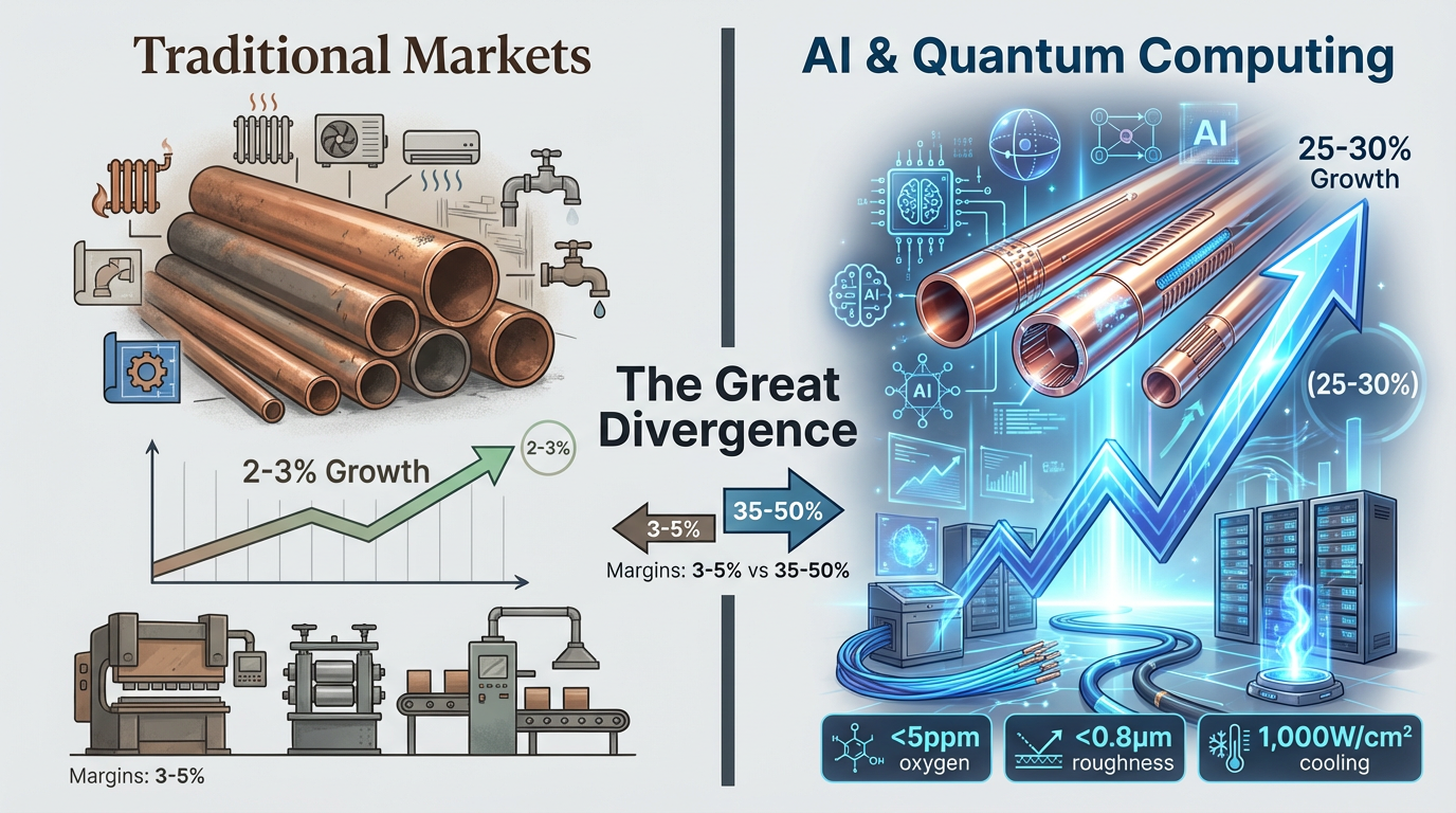 Det globale kobberrør industrien opplever enestående fragmentering. Mens tradisjonell konstruksjon and HVAC-applikasjoner vokse med beskjedne 2-3 % årlig, etterspørsel etter presisjonsrør innen halvlederproduksjon, AI-infrastruktur og kvantedatabehandling øker med 25-30 % årlig. Denne divergensen skaper et todelt marked: Bulkprodusenter sliter med 3–5 % marginer, mens spesialiserte produsenter har bruttomarginer på 35–50 % for rør som oppfyller ekstreme spesifikasjoner.
