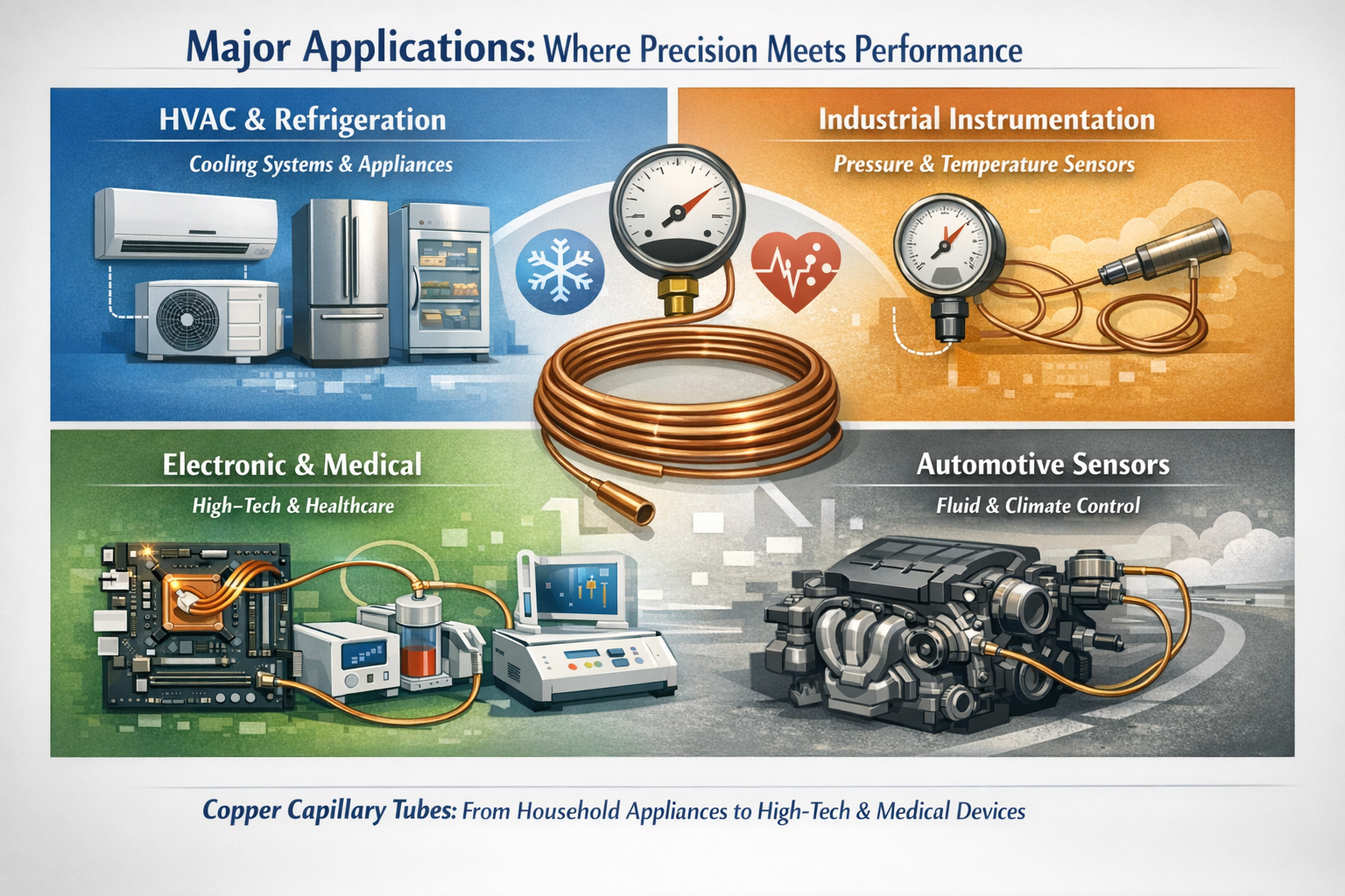 På grunn av deres evne til å kontrollere væskestrømmen med ekstrem nøyaktighet, finnes kobberkapillærrør i alt fra husholdningsapparater til livreddende medisinsk utstyr.