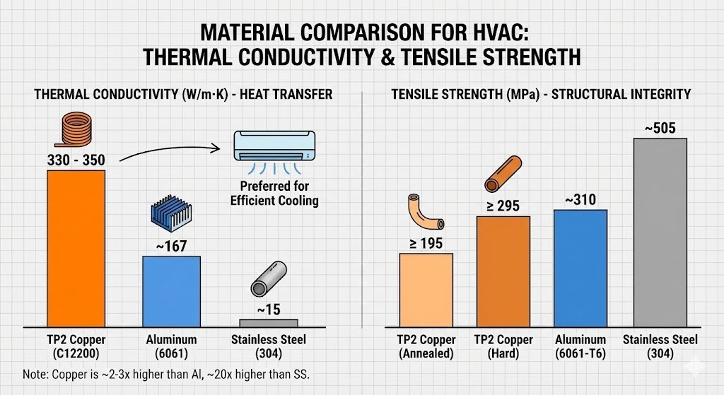 TP2 kobberrør er verdsatt for sin "myke" styrke - de er sterke nok til å holde høyt trykk, men formbare nok til å bøyes til komplekse spoler uten å sprekke.