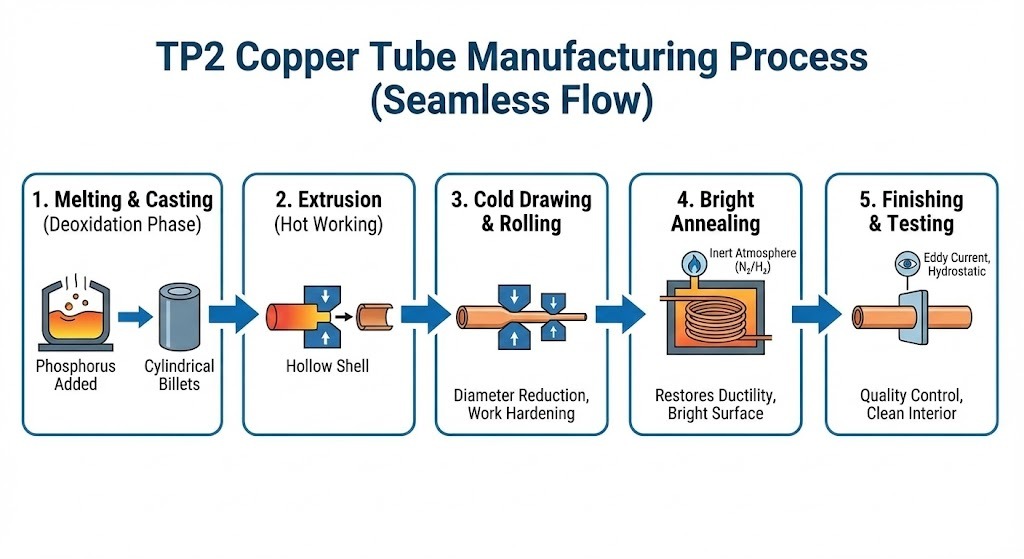 Produksjonen av TP2 kobberrør er en reise fra høyvarmesmelting til høypresisjonskaldbearbeiding. De fleste premium TP2-rør er produsert som sømløse rør , som eliminerer risikoen for svikt i sveisesømmen.