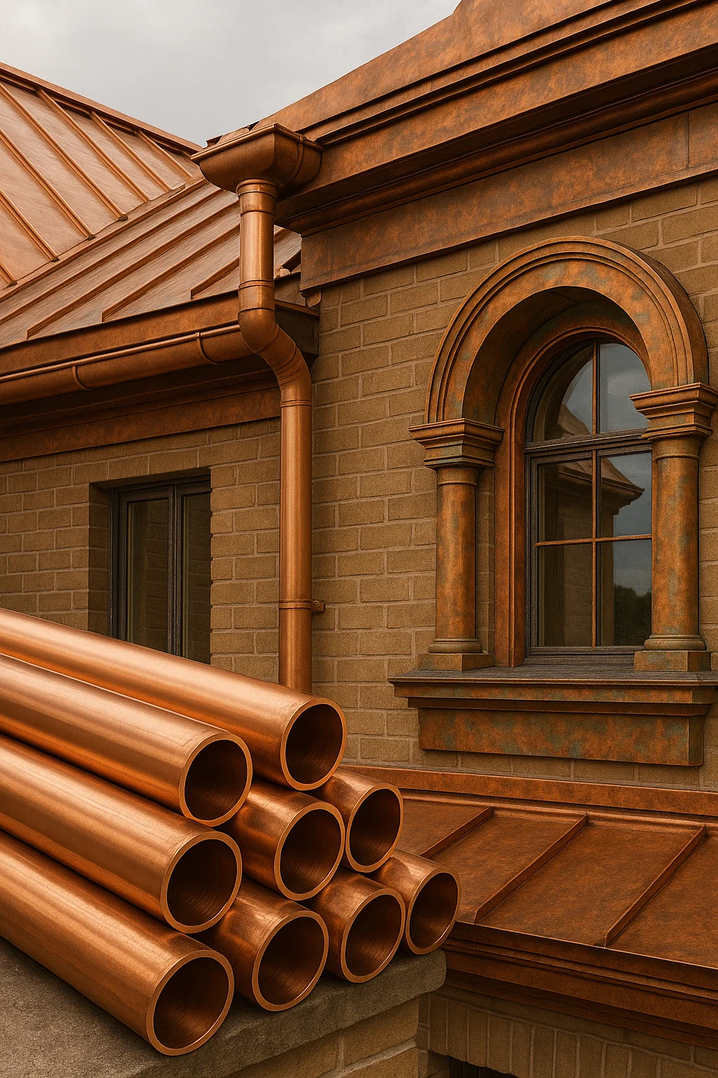 I byggebransjen brukes kobberrør til både funksjonelle og estetiske formål. I arkitektoniske design er kobber verdsatt for sitt attraktive utseende, spesielt når det utsettes for forvitring, noe som gir det en distinkt patina. Kobberrør brukes ofte i taktekking, dreneringssystemer og dekorative funksjoner. Kobbers lang levetid, kombinert med motstand mot vær, korrosjon og brann, sikrer at bygninger utstyrt med kobberelementer opprettholder sin strukturelle integritet og estetiske appell over tid.