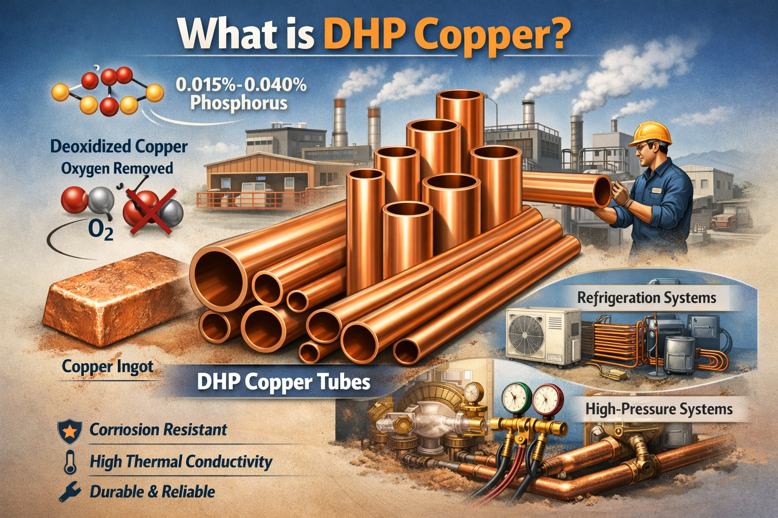 DHP kobber er en høy kvalitet, deoksidert kobber legering som inneholder en liten mengde fosfor , typisk mellom 0,015 % og 0,040 %. Den primære egenskapen til dette kobberet er at det har blitt behoglet for å fjerne oksygen, en prosess som forbedrer motstogen mot korrosjon og sikrer bedre ytelse i høytrykkssystemer. Fosforinnholdet forbedrer egenskapene ytterligere, noe som gjør det ideelt for bruk i applikasjoner der holdbarhet, varmeledningsevne og styrke er kritiske.